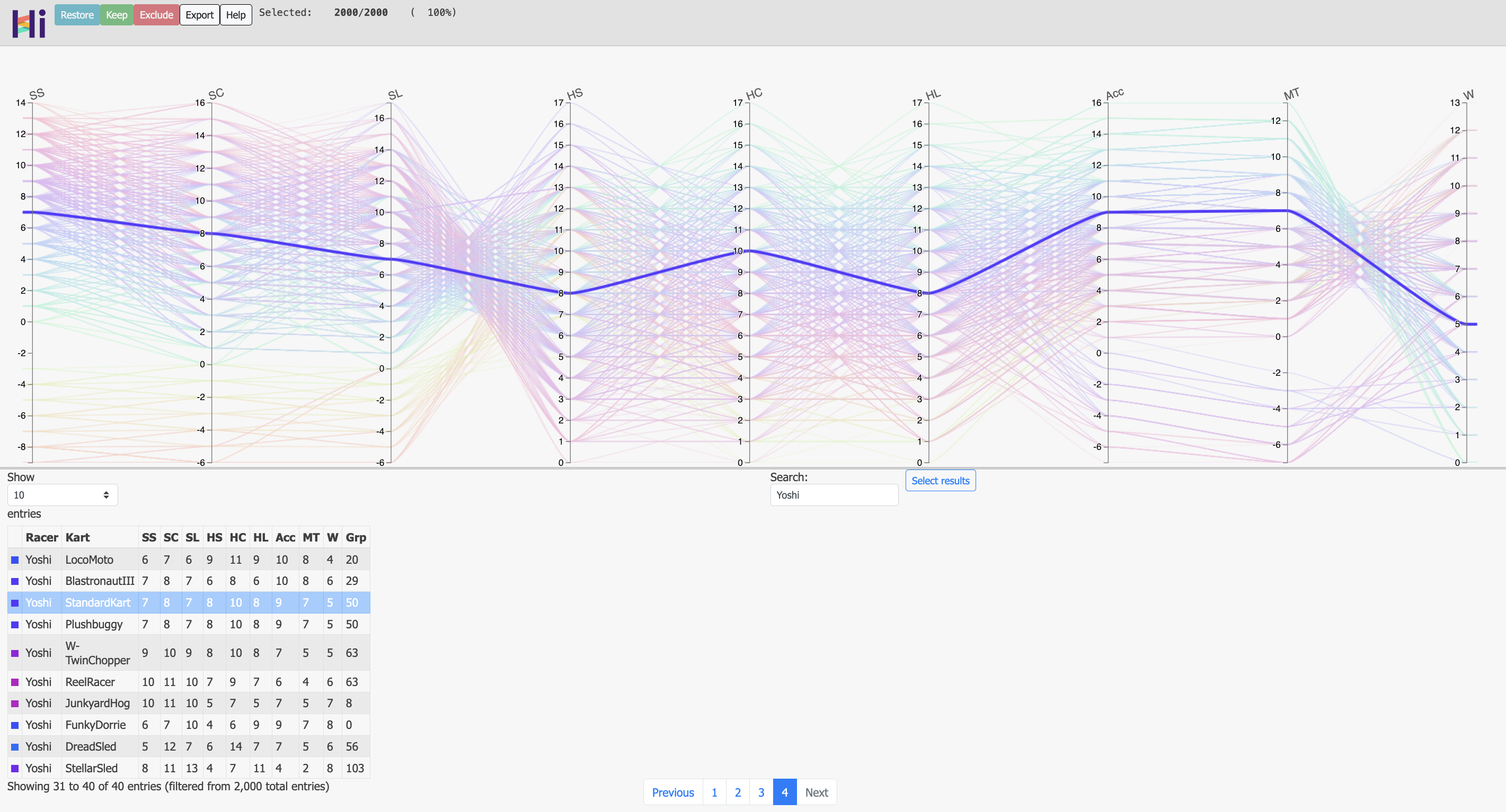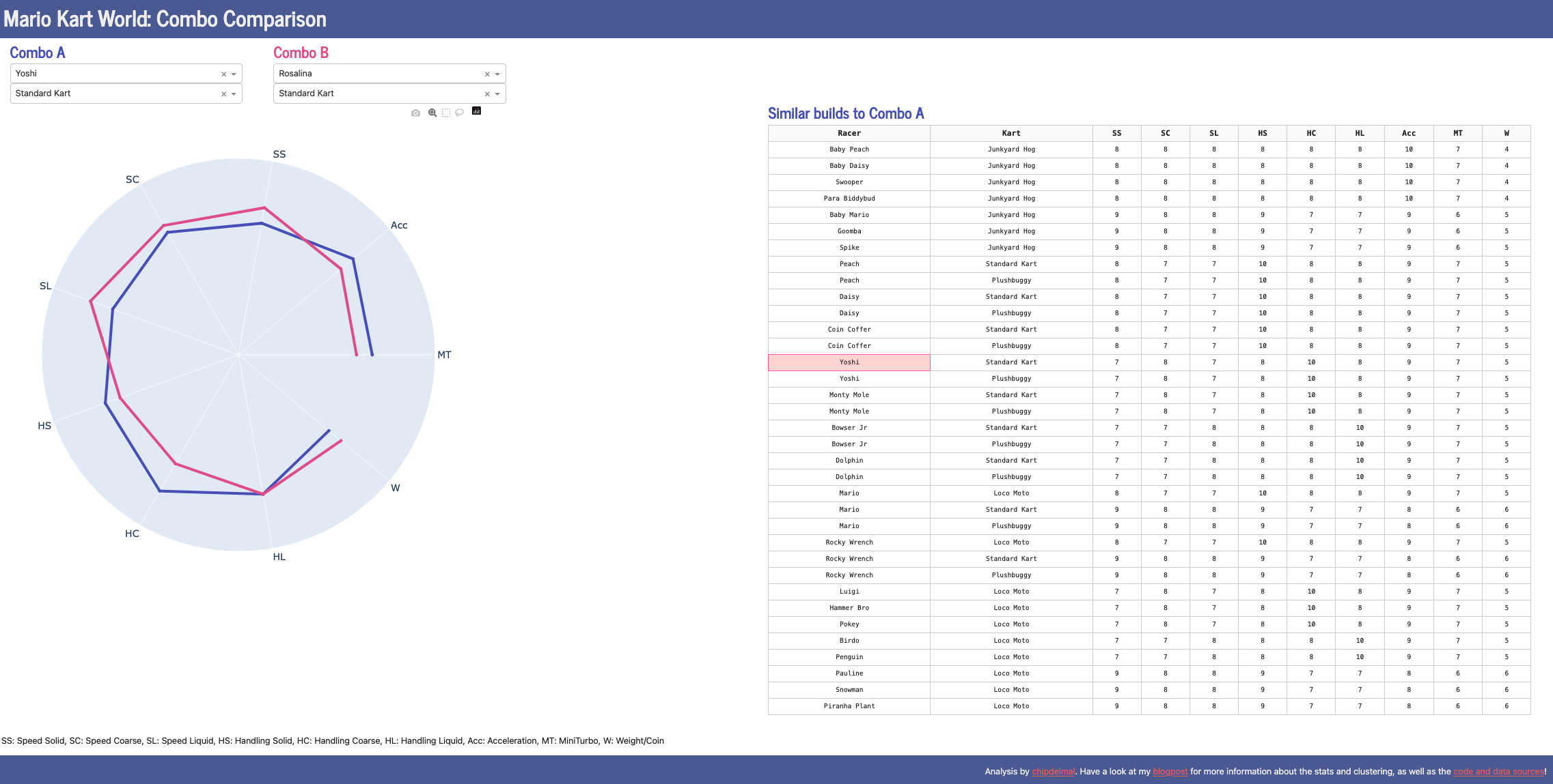 This is useful in case we want to explore some new combinations that don’t diverge too far from our current build, or if we want to see if there’s some other combinations that might be comparable with a character/kart that we like better.